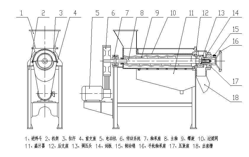 ★ 由前支座、進(jìn)料斗、螺旋、過濾網(wǎng)、盛汁器、后支座、出渣槽等組成,螺旋主軸左端支撐于滾動軸承座內(nèi),右端支撐于手輪軸承座內(nèi),電機(jī)通過一對三角皮帶驅(qū)動螺旋進(jìn)行工作。
